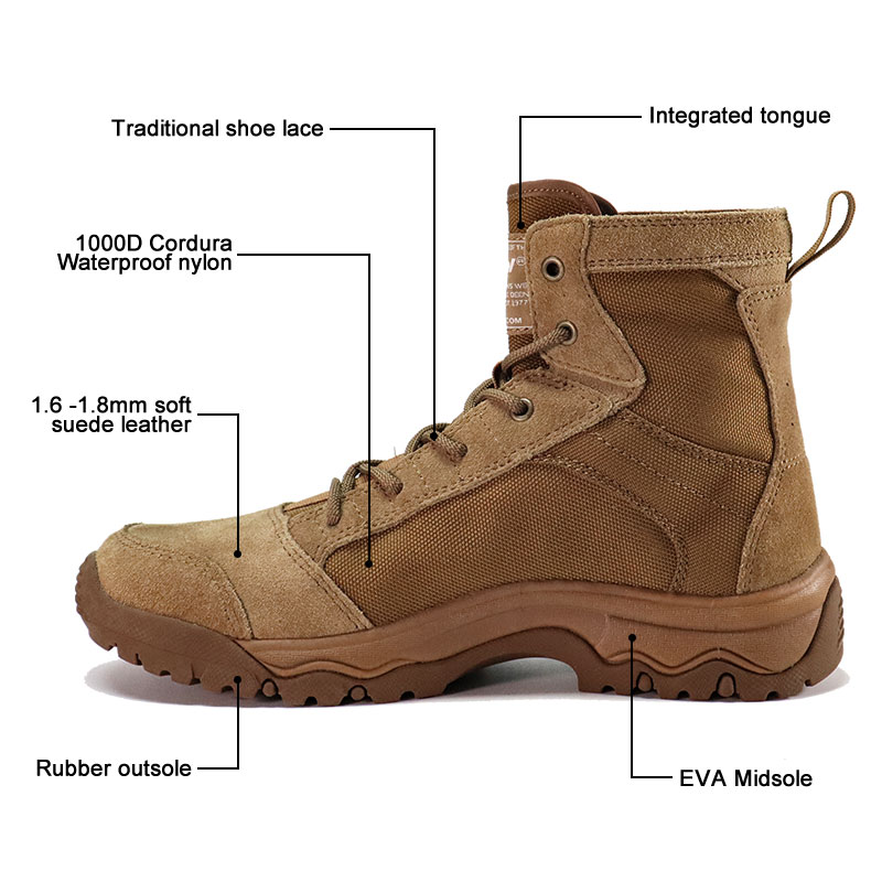 รองเท้าบูทยุทธวิธีทะเลทราย Cordura Fabric Rubber มีในสต็อกและพร้อมส่ง โดยสั่งซื้อเริ่มต้นเพียง 10 คู่ หากต้องการรายละเอียดเพิ่มเติมหรือสอบถามราคา โปรดติดต่อได้ตลอดเวลา การปรับแต่งยังมีให้เลือกสั่งซื้อขั้นต่ำ 800 คู่ และรุ่นนี้มีข้อดีดังต่อไปนี้: