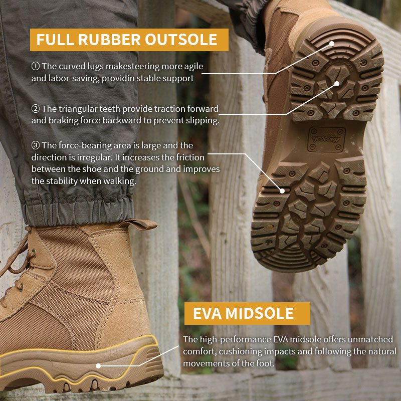 ออกแบบมาเพื่อภูมิประเทศที่ยากลำบากที่สุด รองเท้าบูท Cordura Fabric Rubber Desert Tactical มอบความสบายน้ำหนักเบาและการทรงตัวที่จริงจัง คุณจึงสามารถเคลื่อนไหวได้อย่างมั่นใจเหนือก้อนหิน ทราย และทุกสิ่งที่อยู่ระหว่างนั้น ส่วนบนของ Cordura ทนต่อการเสียดสีและกันเศษซากออกไปไกลหลายไมล์ พื้นรองเท้าชั้นกลาง EVA ประสิทธิภาพสูงช่วยลดแรงกระแทกทุกย่างก้าวและเคลื่อนไหวอย่างเป็นธรรมชาติตามย่างก้าวของคุณ และพื้นรองเท้ายาง? มันยึดเกาะพื้นเรียบและเส้นทางขรุขระเหมือนกัน—สร้างมาเพื่อปรับตัวและทนทาน